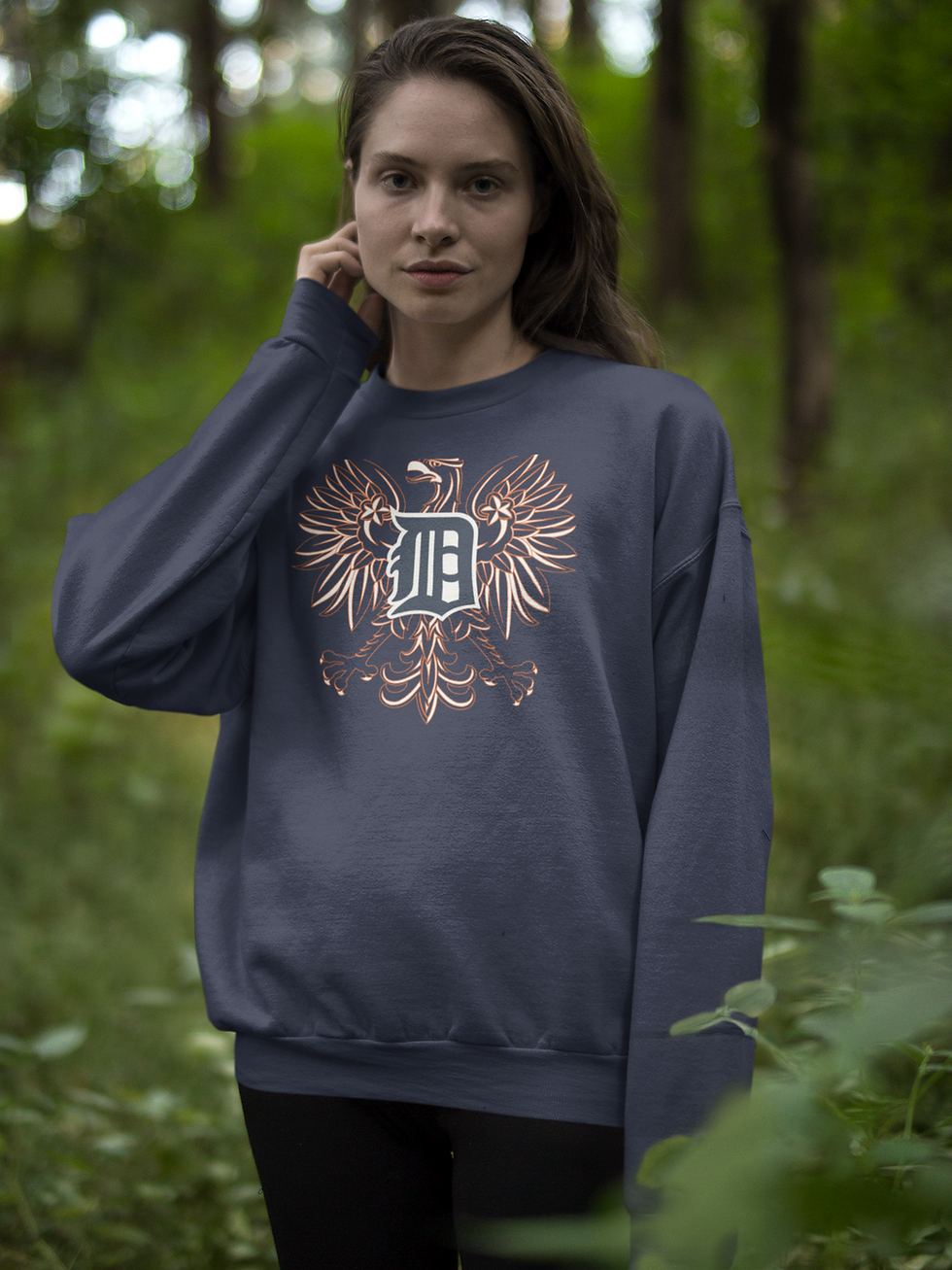 Black with a white eagle with a golden crown, above it the inscription "Polska"